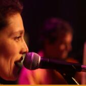 (image : Les Beaux Jours Cie, Le groupe Cascade en concert : Laure Cohen, compositrice, entourée par les violons de Prune Lacante et Gabriel Lenoir)